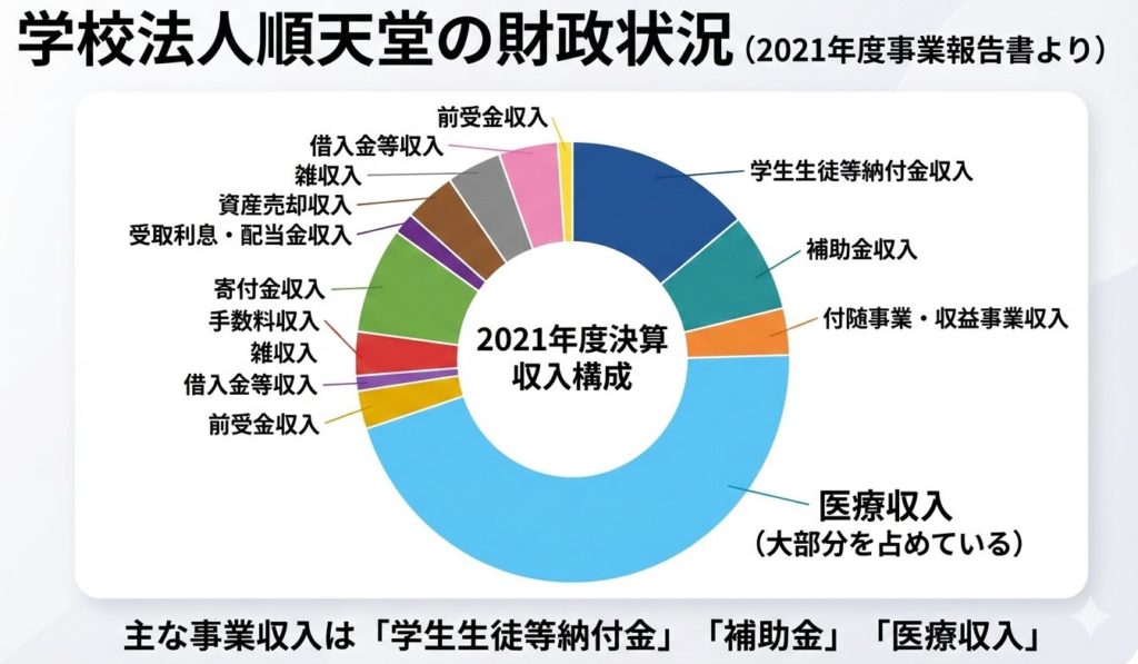 なかでも医療収入が収入全体の大部分を占めており、順天堂医院をはじめとする附属病院が法人の財務を強力に支えています。