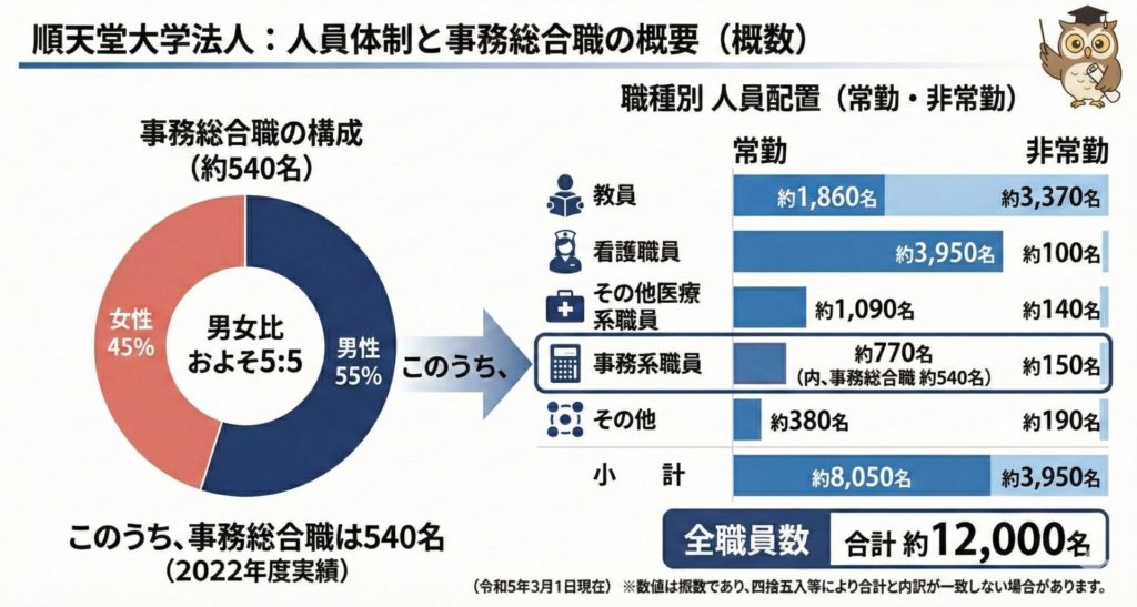 順天堂大学の全職員数は常勤・非常勤合わせて約12,000名(令和5年3月1日時点)です。